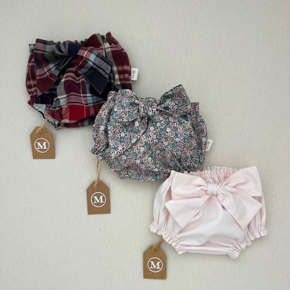 Un esencial para cualquier bebé: culotes , también conocidos como braguitas o cubrepañales, perfectos para usar solos o combinados con vestidos y blusones. Confeccionados con tejidos de alta calidad y forrados en 100% algodón orgánico, son suaves para la piel delicada de tu bebé. En esta variante le hemos añadido un gracioso lazo en el delantero. Además, ofrecemos la opción de combinarlos con blusa y capota a juego de la misma tela, creando un look completo y coordinado. #Cubrepañales #AlgodónOrgánico #RopaBebé