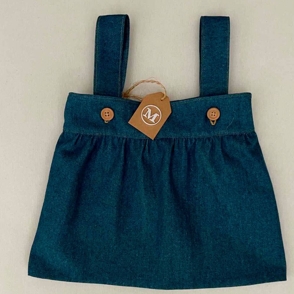 "Reinvención en Denim: Este año, el denim se eleva en nuestra colección, fusionando flexibilidad y calidez en nuestras faldas con tirantes de talle alto. Una propuesta moderna con un toque clásico para las pequeñas amantes de la moda. Confeccionadas con la máxima calidad en algodón 100% y un delicado forro de algodón orgánico 100%. Estilo y sostenibilidad en cada puntada."