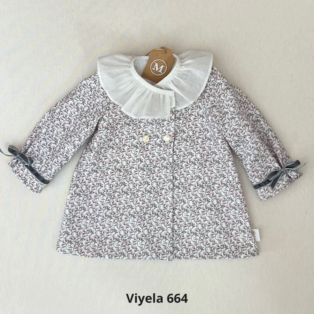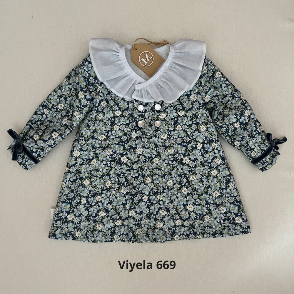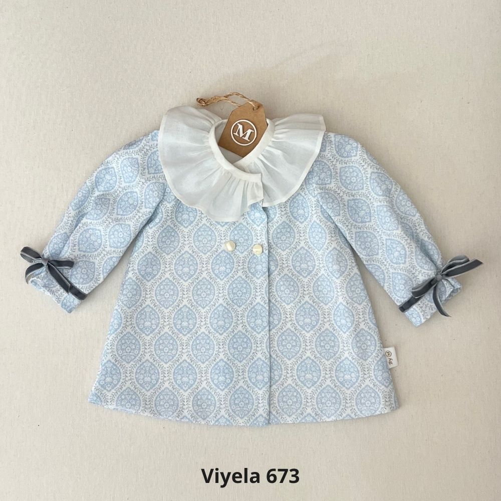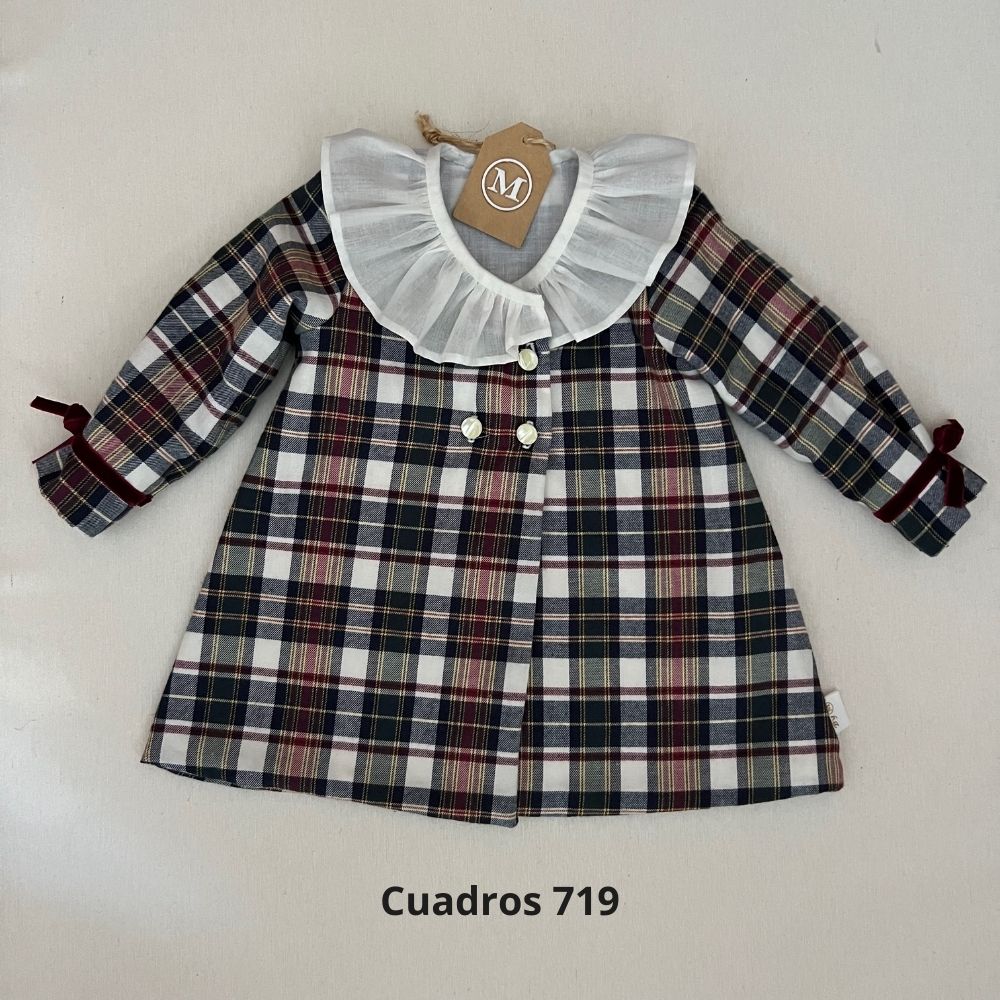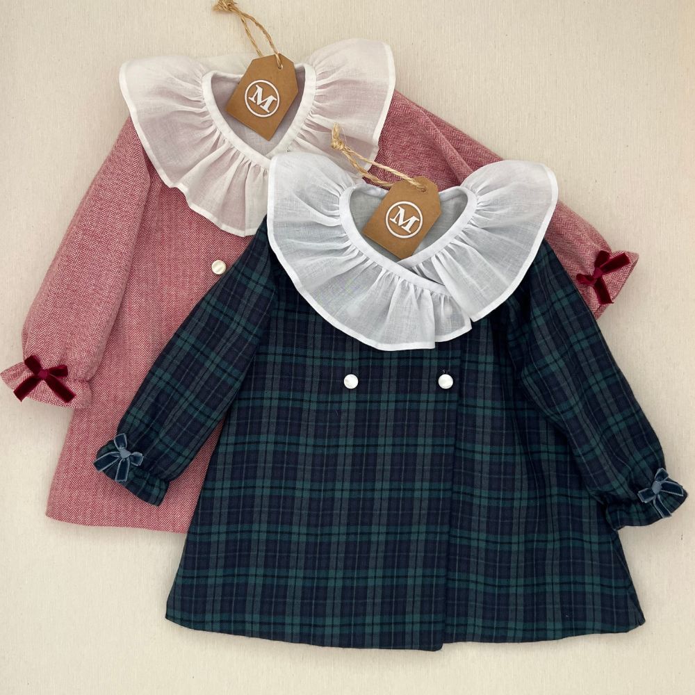 "Vestido tipo abrigo confeccionado en manga larga y con detalle en terciopelo y cuello rizado en batista organizada. Cada pieza está forrada con algodón orgánico 100%, garantizando suavidad y calidad en cada momento."